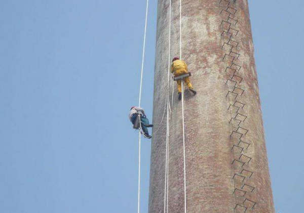煙囪修補(bǔ)加固主要注膠修補(bǔ),大致步驟是:觀測(cè)裂縫——基層處理——確認(rèn)注入口——配封縫膠——封閉裂縫——安設(shè)底座——配灌漿樹脂——灌漿——拆除灌漿器——清洗灌漿器。需要專業(yè)人員佩戴安全繩、防墜器、安全帽等防護(hù)裝備對(duì)煙囪進(jìn)行加固。